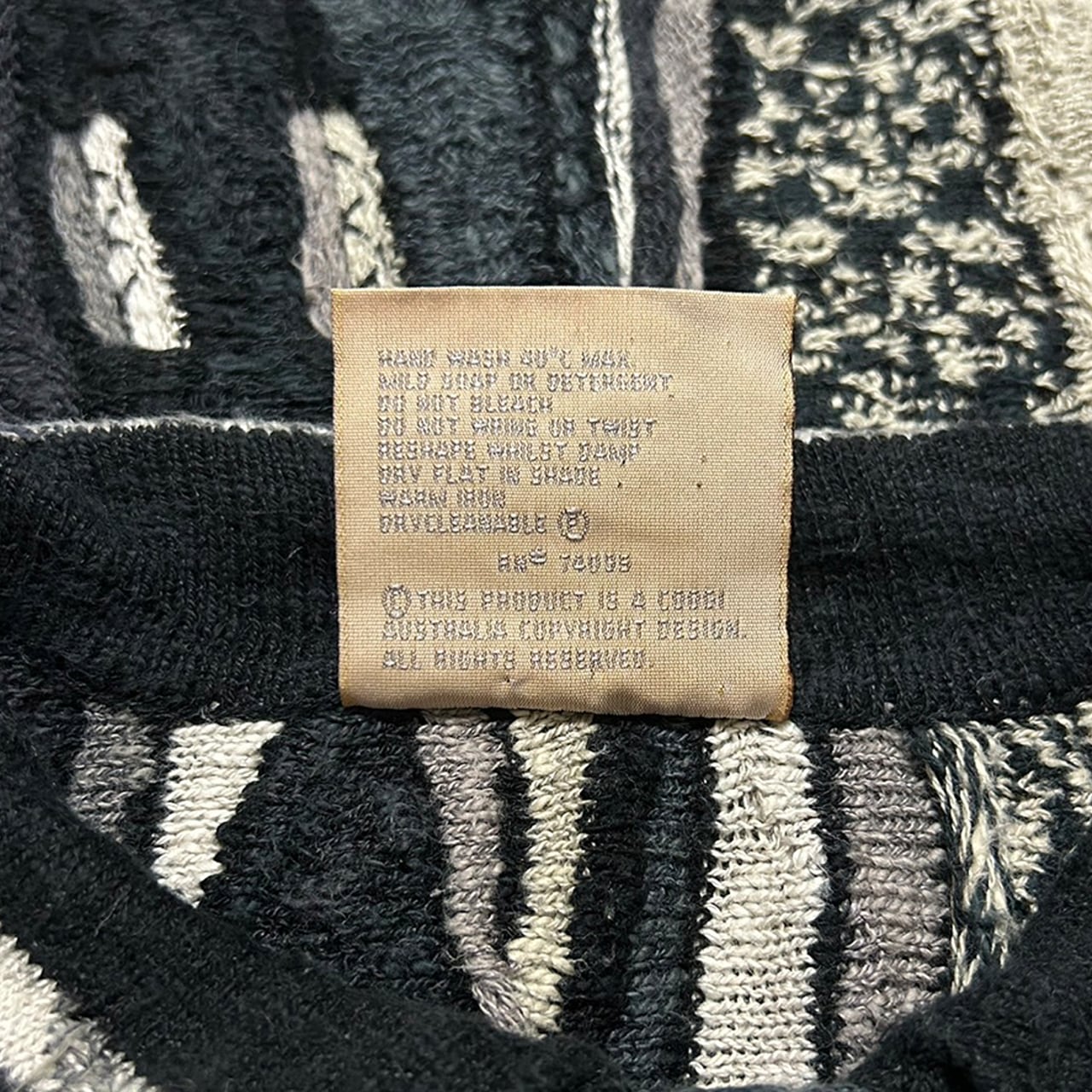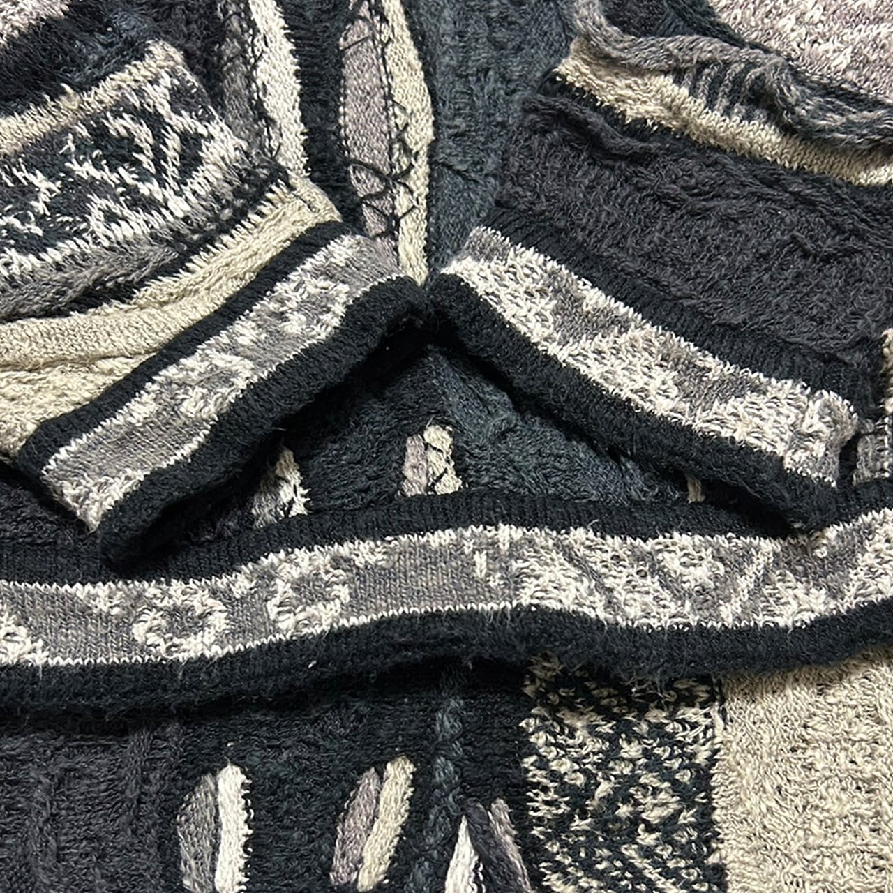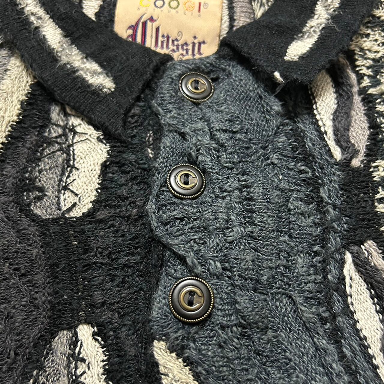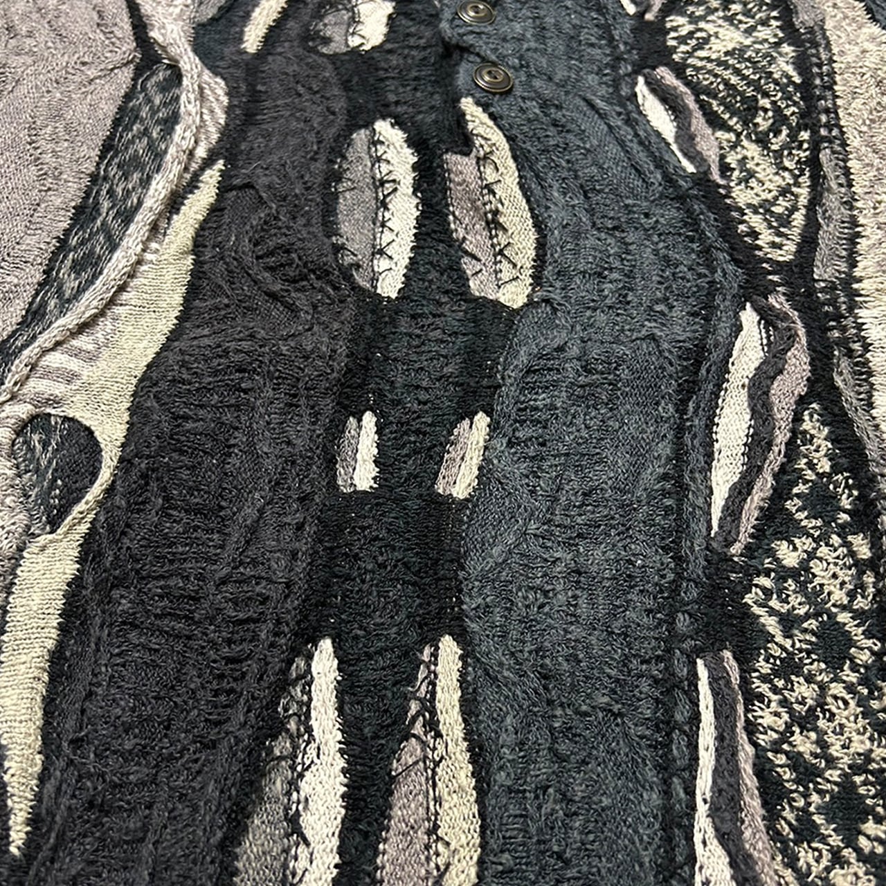 COOGIならではの芸術性を持たせつつ、白と黒の落ち着いた雰囲気をもつ最強のポロニットになります。カラフルなデザインはよく見かけますがこの色合いは中々見かけません。モノトーンデザインですので普段使いもしやすく寒い時期に活躍できると思います。正直売りたくないです;;